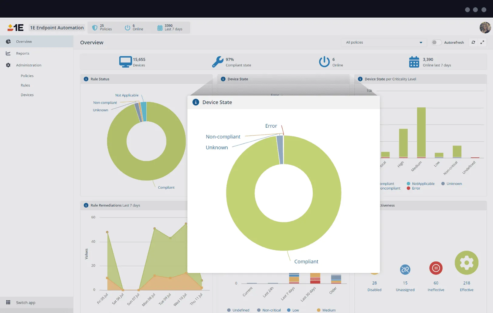 1E Endpoint Automation provides policy and rule enforcement, device state reports, and real-time device visibility and exploration.