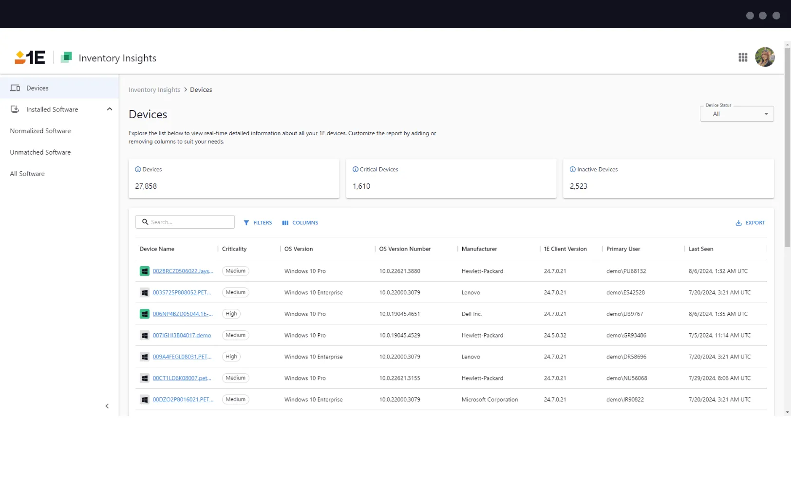 1E Inventory Insights provides real-time software and hardware inventory data for every device. Whenever an inventory change occurs on a device, it’s instantly reflected in the 1E Platform.