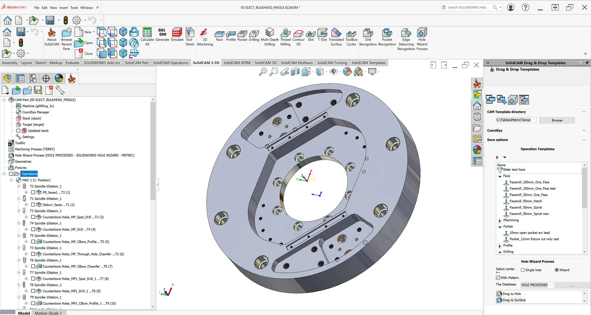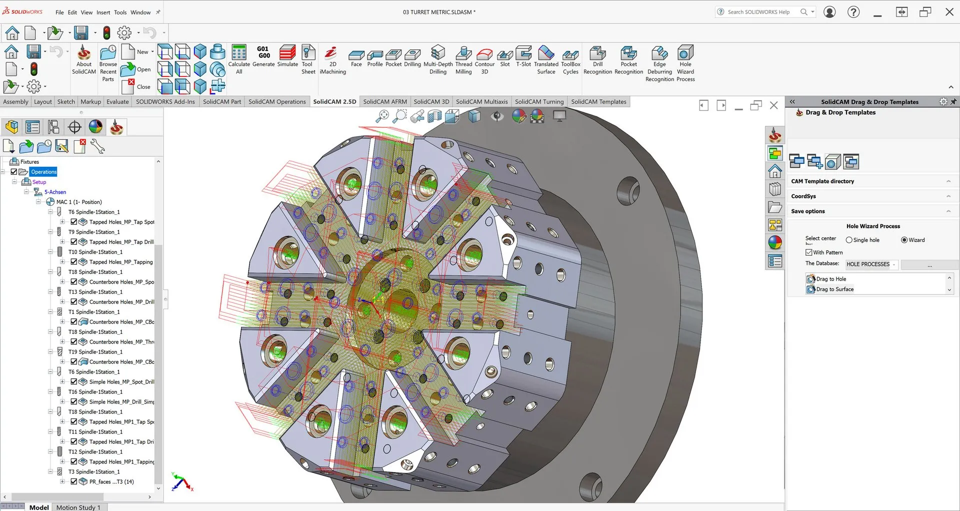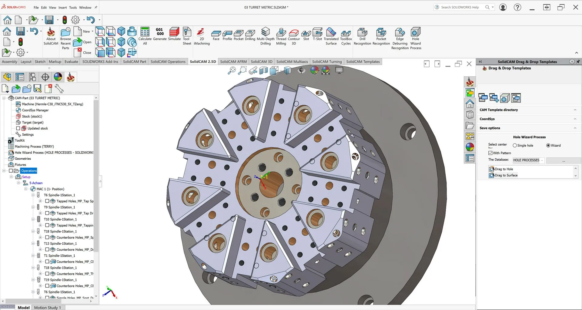 SolidCAM’s Hole Wizard, with Drag & Drop Machine Processes optimizes the task of programming multiple operation for complex holes.