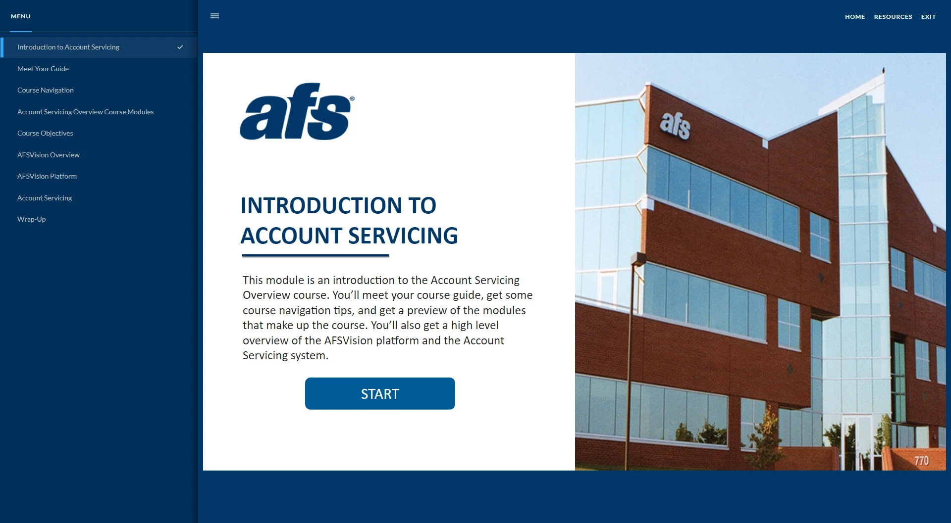 With AFS eLearning courseware, AFSVision clients can now lay the groundwork to use all the AFSVision platform has to offer with self-paced, online training in the Account Servicing, Post-Approval, Loan Administration, and the One Stop Inquiry areas of AFSVision.