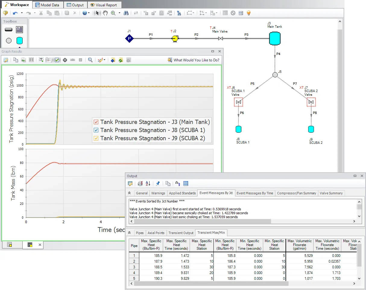 - Accurately simulates high-speed, acoustic transients in steam and gas piping systems, including choked flow conditions, turbine trips, tank blowdowns, and heat exchanger tube ruptures.