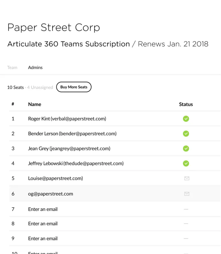 Articulate 360 Teams lets you manage user, seat, and billing information in one place.