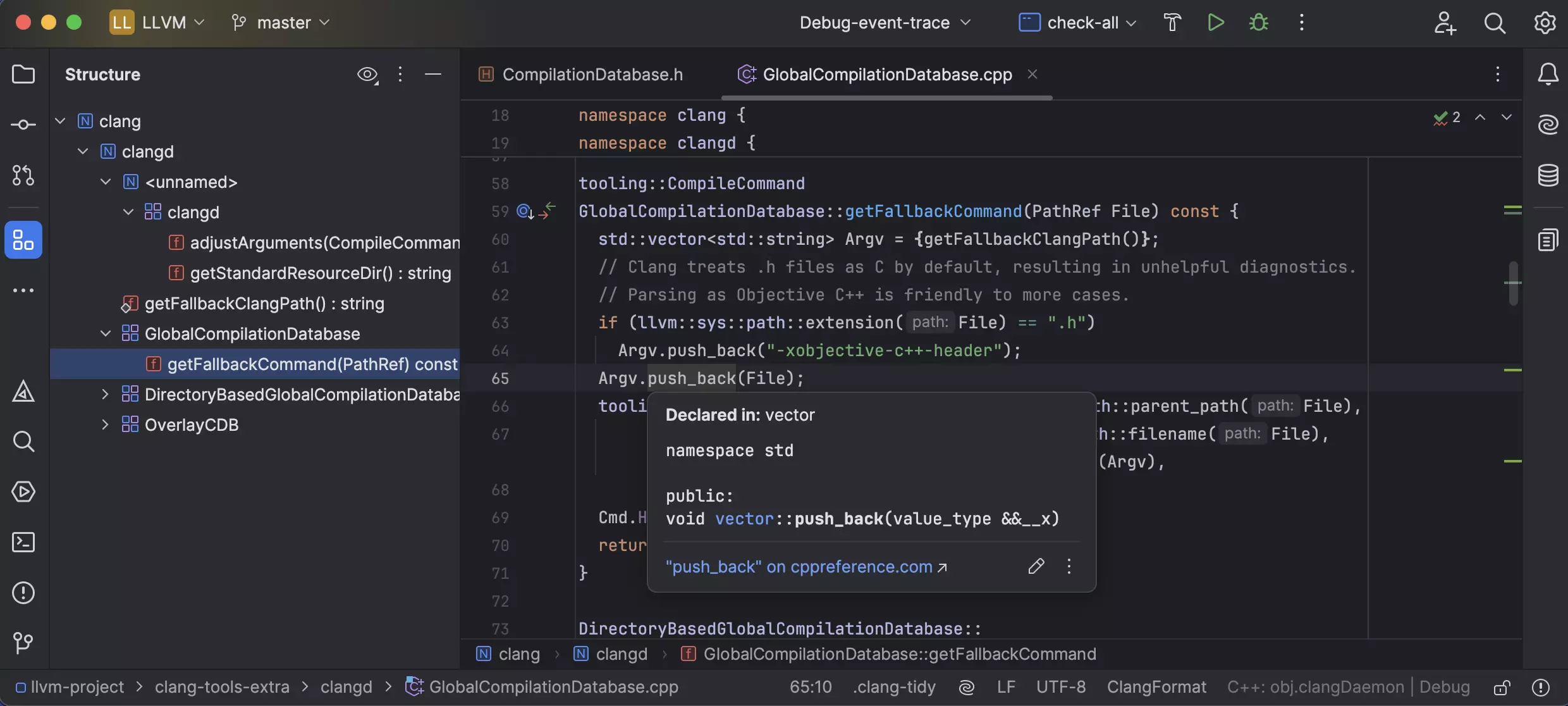 Regardless of your project’s size, CLion allows you to jump between definitions and declarations quickly, navigate through code hierarchies, and search for usages of any symbol. CLion’s Search Everywhere feature is there for you to find anything, be it a class, a file, or an IDE action.