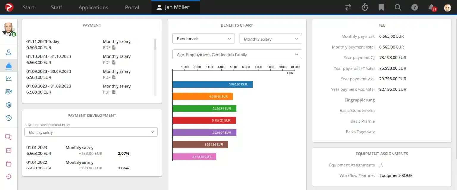 The rexx HR software offers interfaces to common payroll systems. Different pay types and payments are supported: Monthly salary, hourly wage, daily rate, bonuses, premiums or calculation formulas for annual payments. All relevant pay-related information is displayed in just one system.