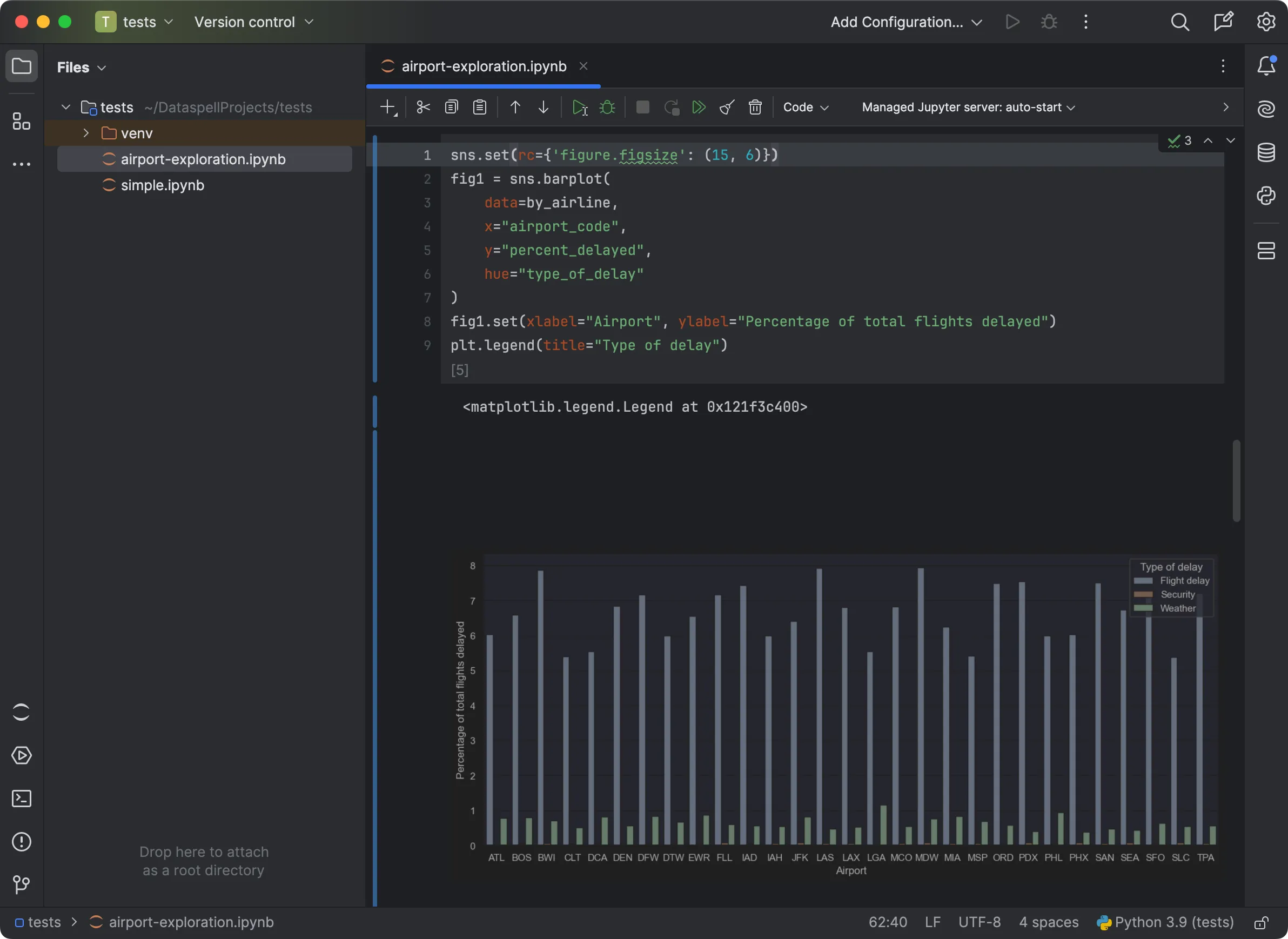 Start working with both local and remote notebooks in DataSpell in no time. Benefit from appealing graphs and visualizations and use SQL cells, Python, Markdown, or no-code – all within a unified intelligent notebook.