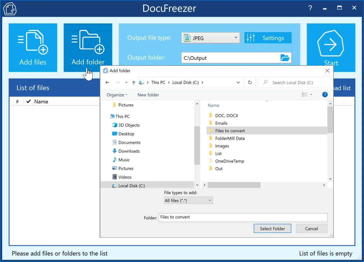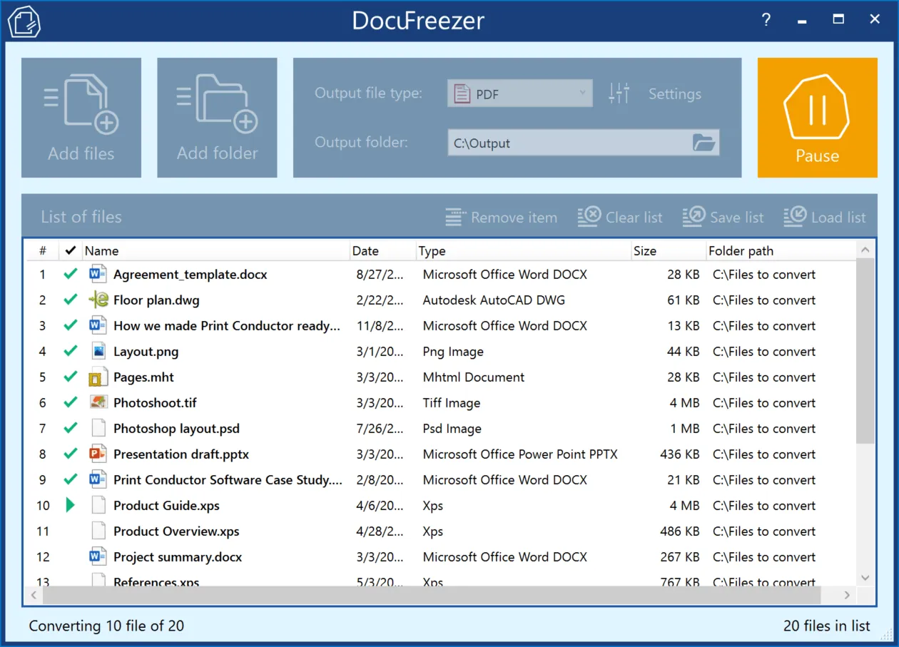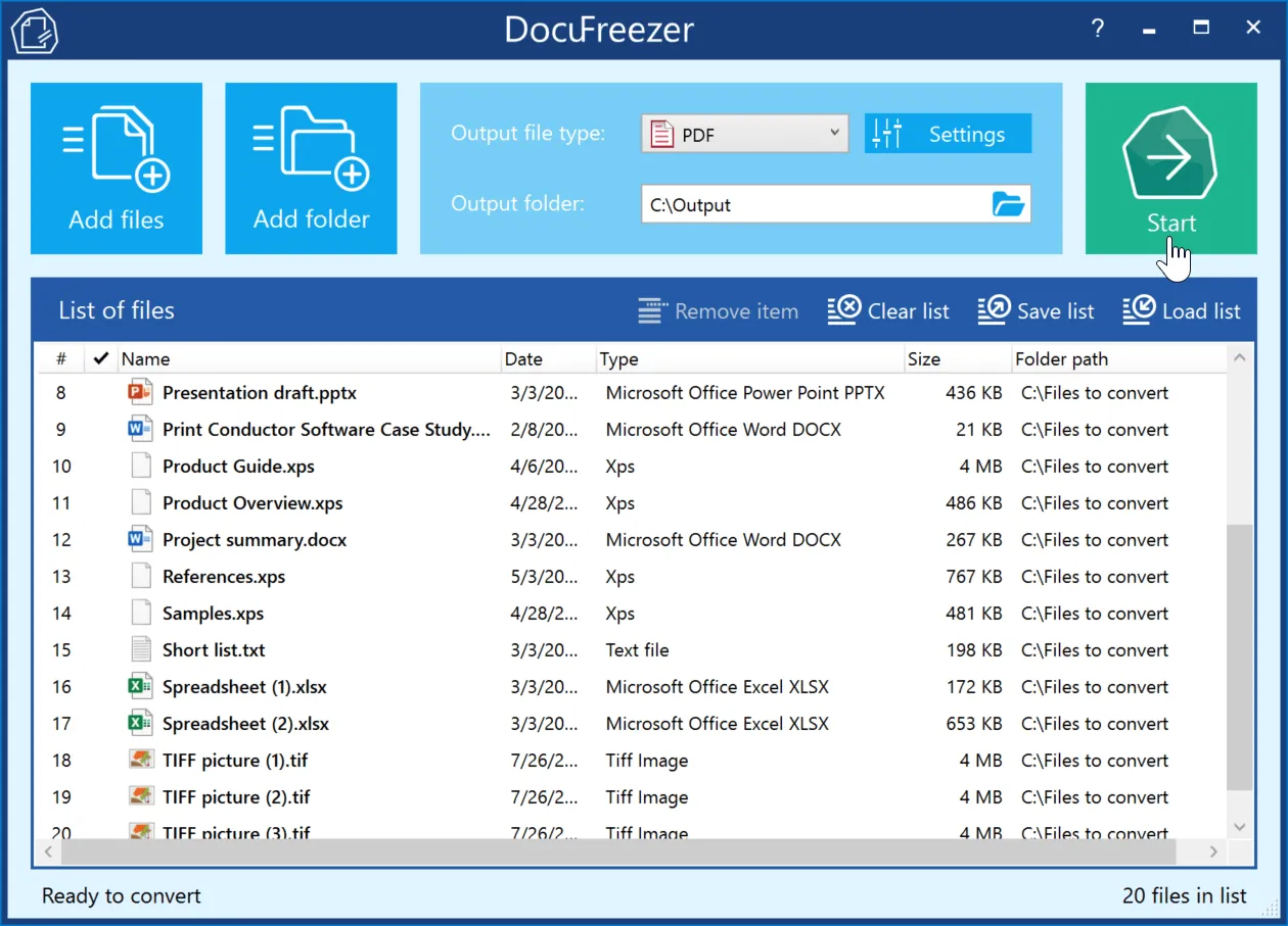DocuFreezer batch converts documents and images to PDF, JPG, PNG, TIFF, or TXT on Windows, preserving original appearance and protecting content.