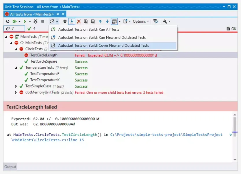 dotCover can figure out on-the-fly which unit tests are affected by your latest code changes, and automatically re-runs the affected tests for you. The continuous testing mode can be switched on for any unit test session: this way you can choose which tests you want to run continuously and which to run the traditional way.
