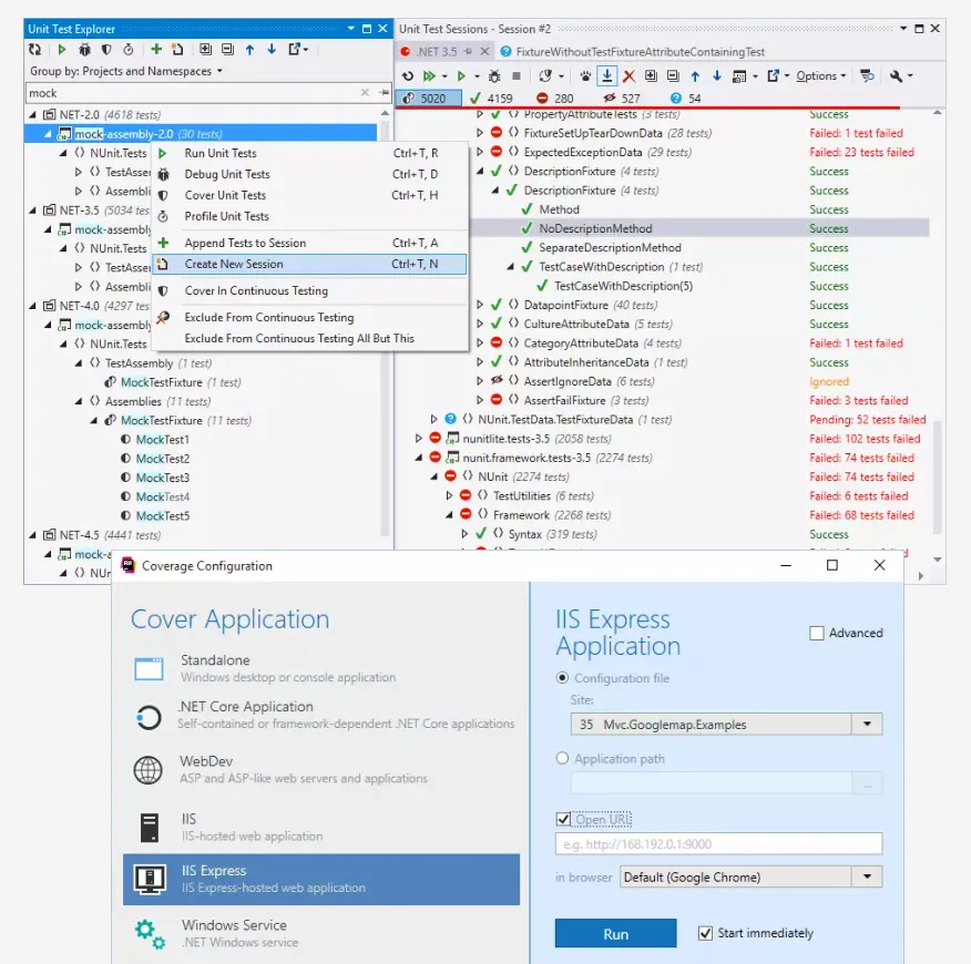 Execute and debug unit tests and run coverage analysis of unit tests in Visual Studio or using the command-line utility. dotCover supports many unit testing frameworks including MSTest, NUnit, xUnit, and MSpec.