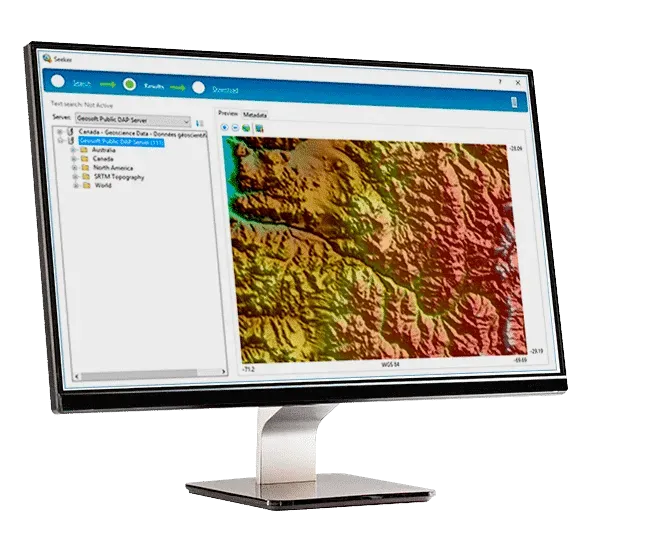 Use Seeker to access the Geosoft Geoscience Data Service (powered by DAP). Quickly find and download public geoscience and topographic data for your project area.