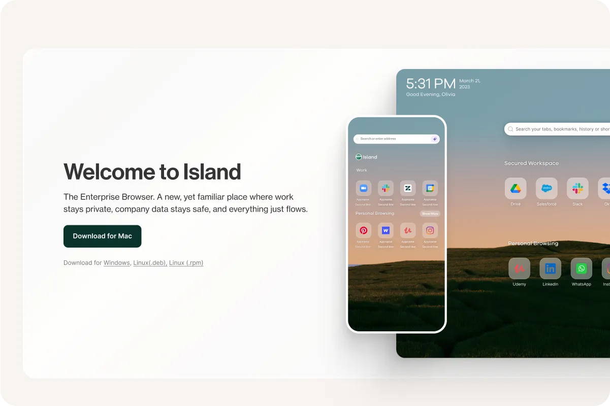 - Secure, browser-first onboarding: Deploy Island to endpoints or allow self-installation; no shipping hardware or provisioning VDI required.