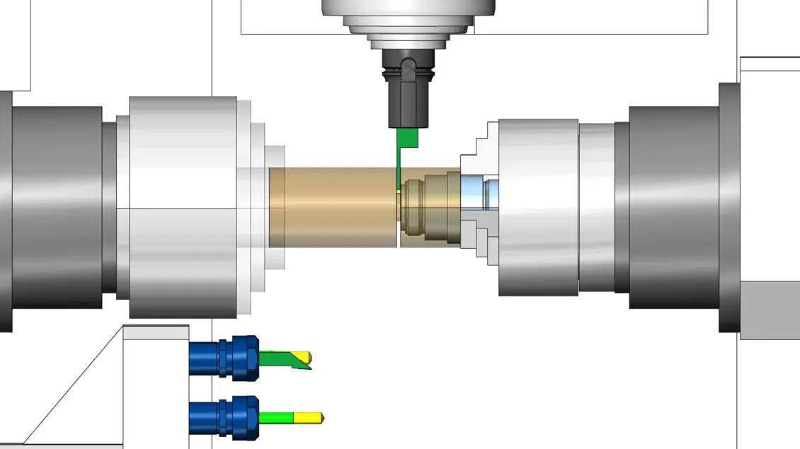 Reduce machining time and stablize the part machining by using Sharing Axes and Drive Unit features. Synchronize two turning operations on different turrets at the same time, and under specific conditions, turning at the same spindle, or synchronize two milling operations on different turrets, using the same rotary axis.