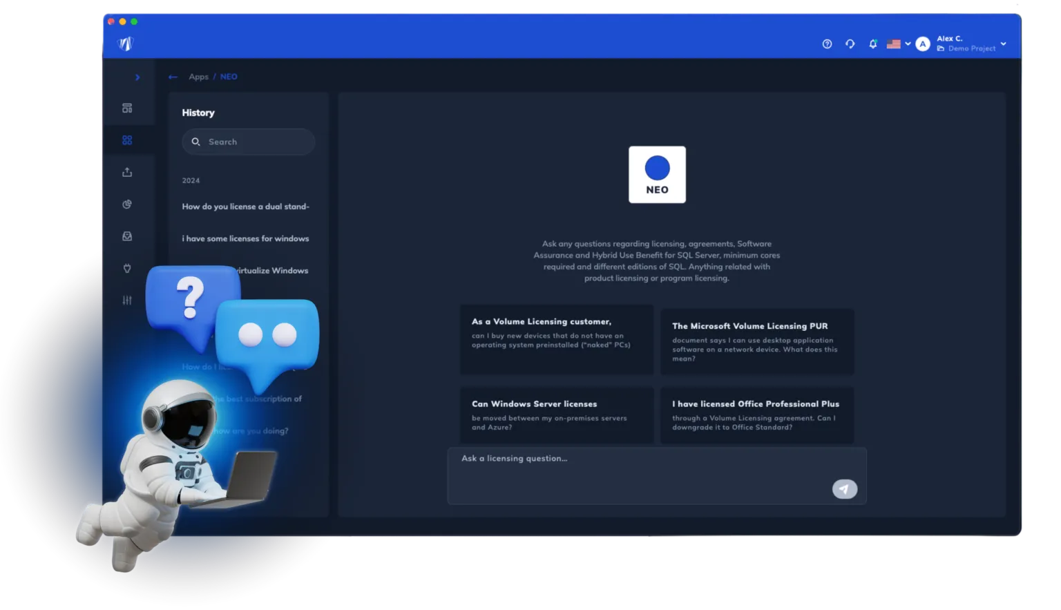 Built to deliver fast, reliable answers to your licensing questions, NEO eliminates hours spent searching for complex software licensing details. It provides instant, accurate insights validated by seasoned licensing consultants—ensuring the answers you receive are always dependable. With NEO, you’ll quickly clarify licensing uncertainties, confidently manage compliance, and make informed software decisions without the guesswork.