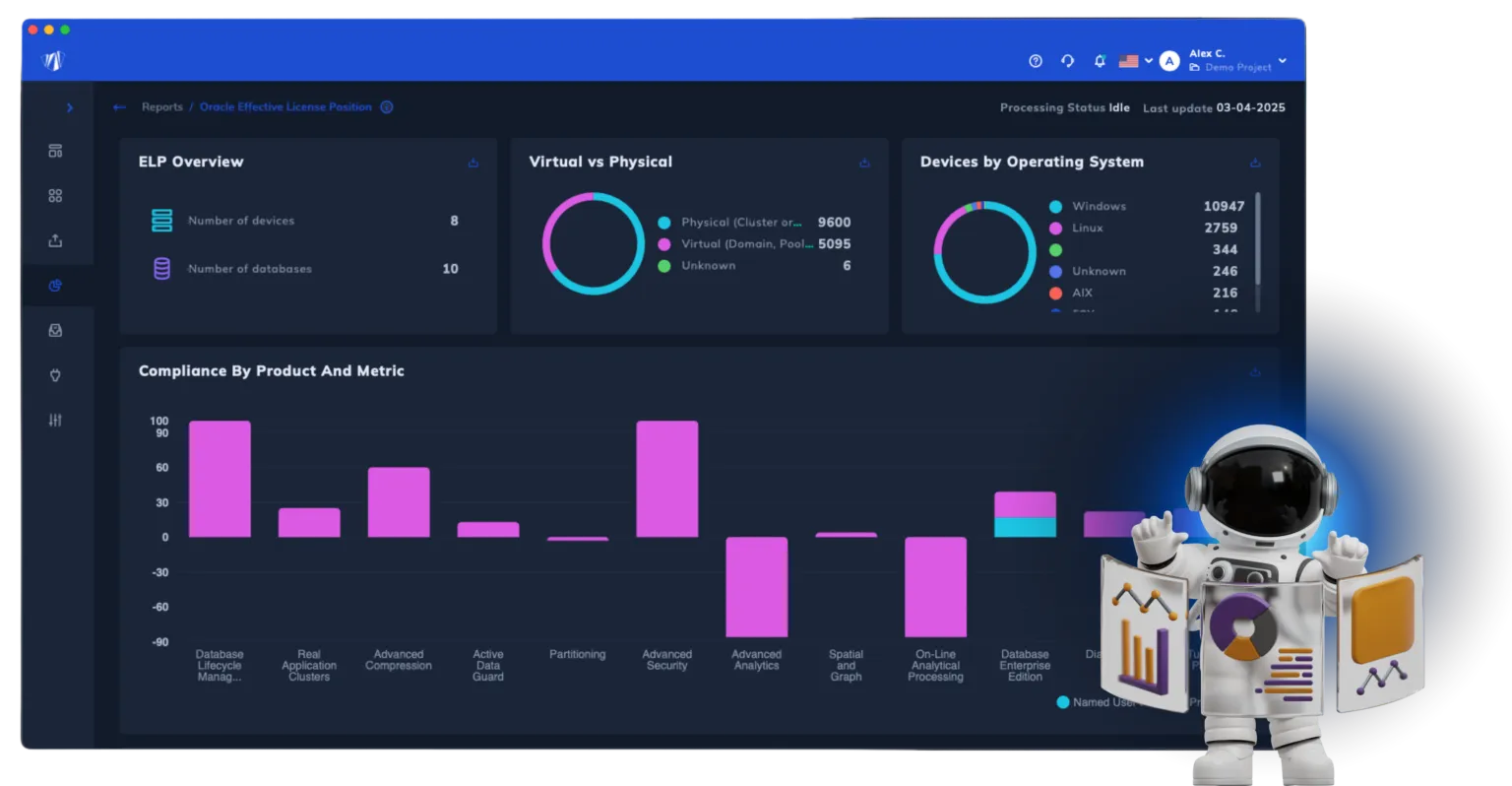 - Compliance Confidence: Ensures accurate Oracle licensing positions with validated data and evidence.