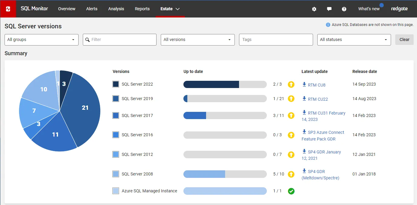 Redgate Monitor grows and adapts with your server estate. Regardless of where your servers are hosted, consistent monitoring for on-prem and cloud databases means you can manage your entire environment from a single pane of glass - allowing you to stay on top of configurations, access rights, installed versions and patches, licensing, disk usage statistics, backups and more.